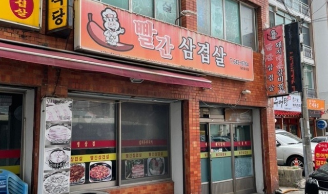 눈에 보이는 붉은 벽돌 빨간 간판이 빨간 빨간 삼겹살집. 그런데 눈에 보이는 메뉴에는 매운 갈비찜과 간장갈비찜… 이게 무슨 말이에요?